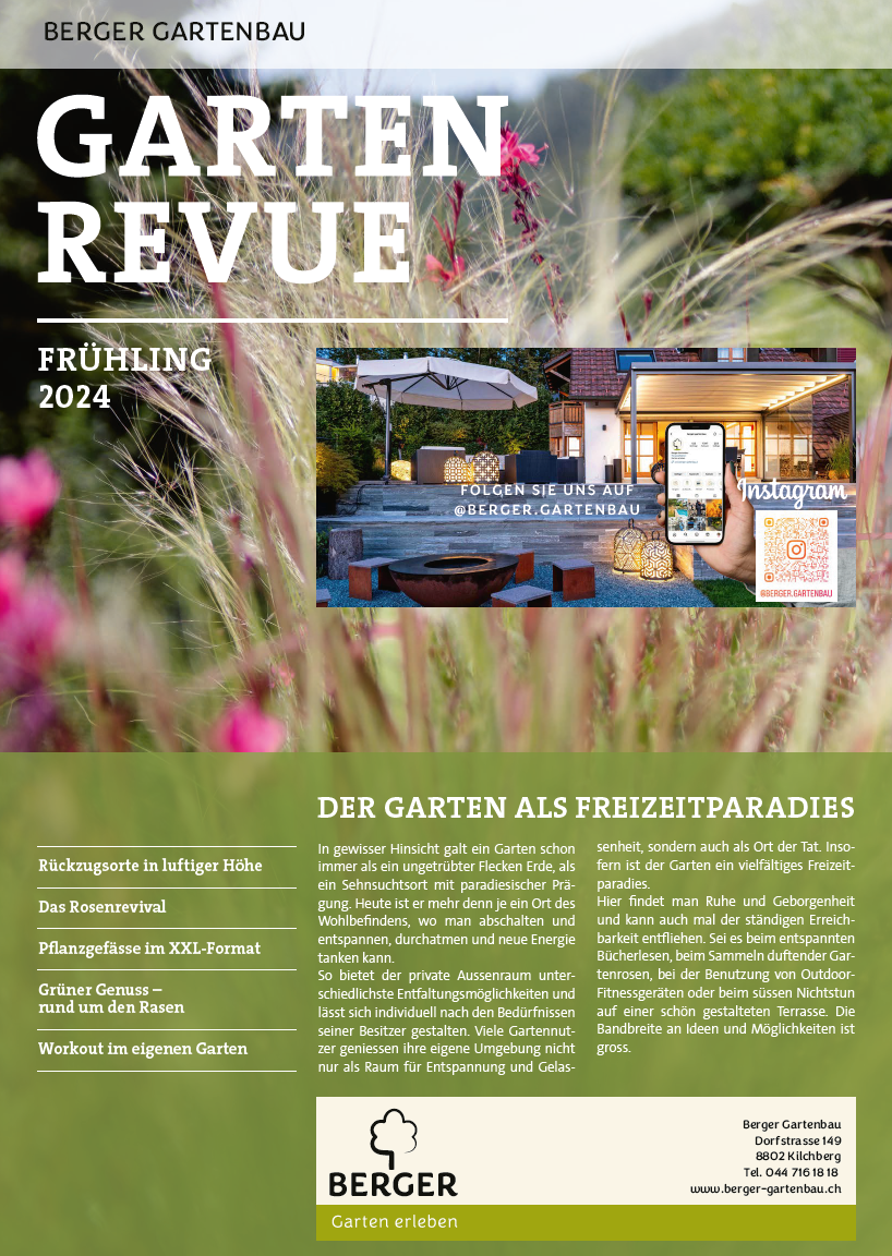 Der Frühling steht vor der Tür und mit ihm erwacht die Natur zu neuem Leben. Entdecken Sie in der aktuellen Ausgabe der Gartenrevue Frühling 2024 inspirierende Möglichkeiten zur optimalen Nutzung Ihres Gartens oder Ihrer Terrasse. Von entspanntem Bücherlesen bis hin zur Nutzung von Outdoor-Fitnessgeräten – die Optionen sind grenzenlos.